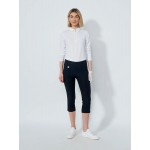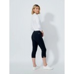 Magic capri pants are made of a super stretchy material that makes them fit both tight and comfortable. The leg length ends just below the knee with a small slit on the leg and the waistband is wide without buttons that chafe. The pants have a ball marker and two pockets in the front and two in the back.